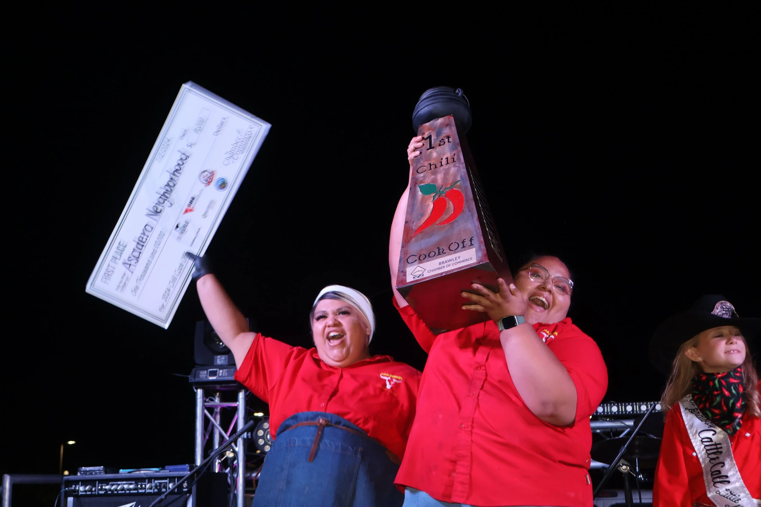 Sandra and Jennyffer Zepeda of Asadero Neighborhood triumphantly display their first-place trophy and prize check to the gathered crowd at the 2024 Cattle Call Chili Cook-Off in Brawley on Saturday, Nov. 2.